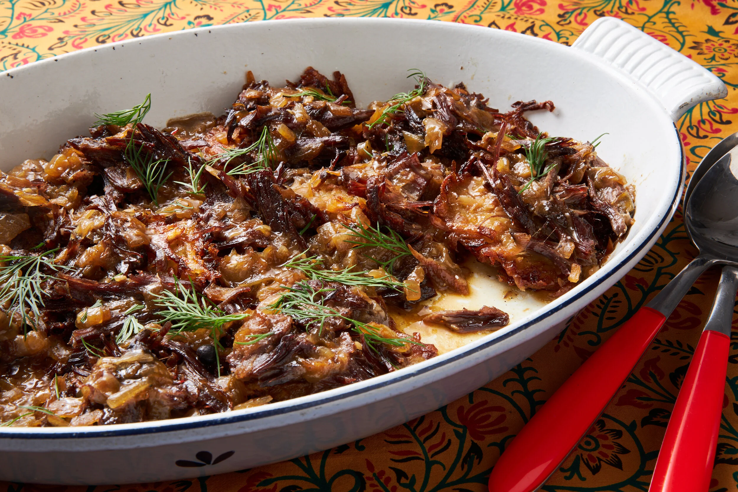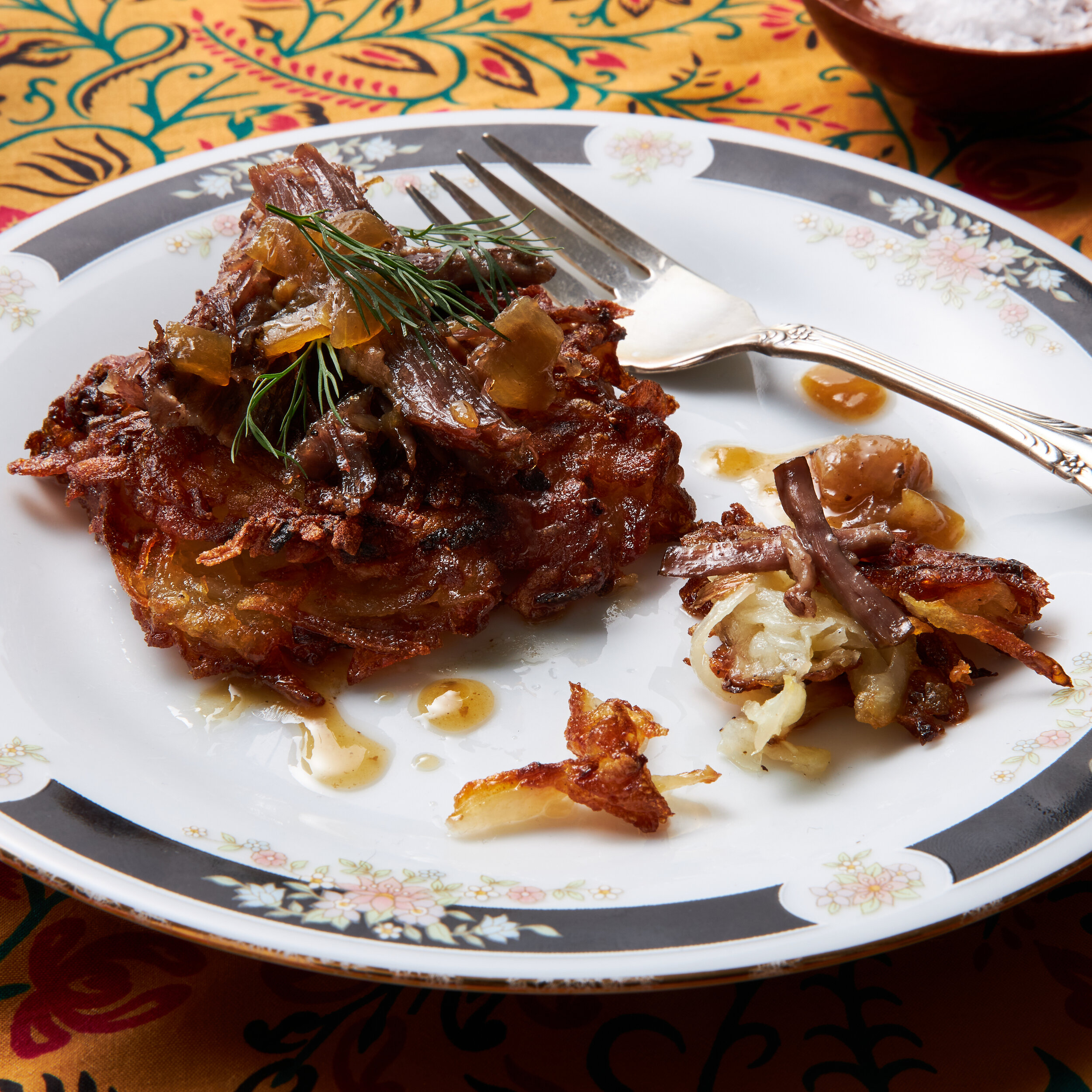 Today, Elizaveta makes latkes for her family often. Her rendition nods to abundance, topping potato pancakes with rich braised beef. It’s a recipe and tradition she brought with her when she left Ukraine in 1991 for California, the year after her mother passed, and to New York where she retired.